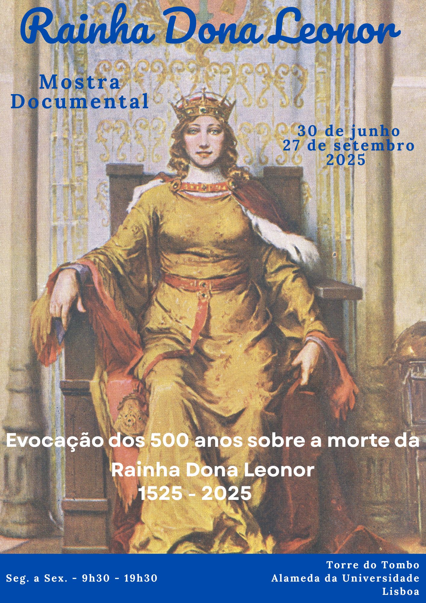 No ano em que se evocam os 500 anos sobre a morte da Rainha Dona Leonor, o Arquivo Nacional Torre do Tombo promove, entre 30 de junho e 27 de setembro de 2025, uma mostra documental que integra um conjunto de documentos, onde é possível observar o papel da Rainha como benemérita e fundadora de causas sociais, assim como a sua dedicação à cultura e às artes.