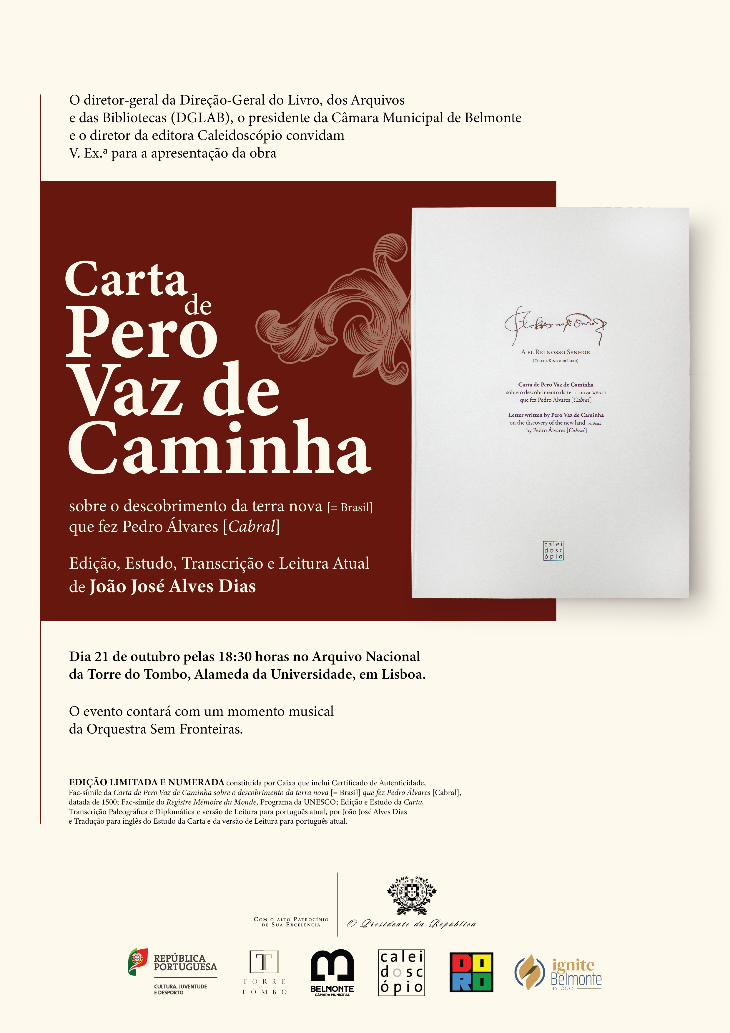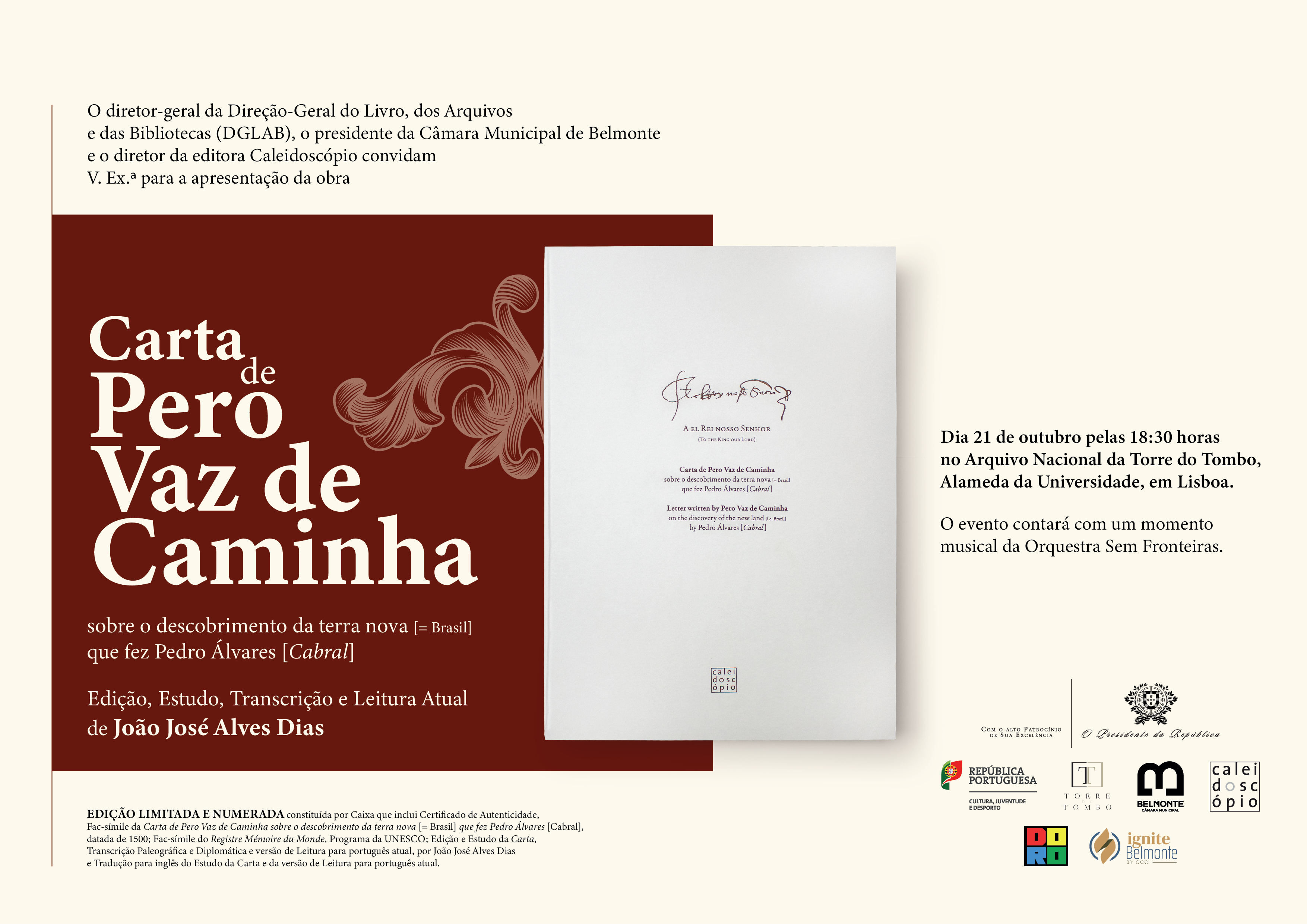 O diretor-geral da Direção-Geral do Livro, dos Arquivos e das Bibliotecas (DGLAB), o presidente da Câmara Municipal de Belmonte e o diretor da editora Caleidoscópio convidam V Ex.ª para a apresentação da obra Carta de Pêro Vaz de Caminha sobre o descobrimento da terra nova [= Brasil] que fez Pedro Álvares [Cabral], edição, estudo, transcrição e leitura atual de João José Alves Dias, que ocorrerá no dia 21 de outubro pelas 18h30 no Arquivo Nacional da Torre do Tombo.