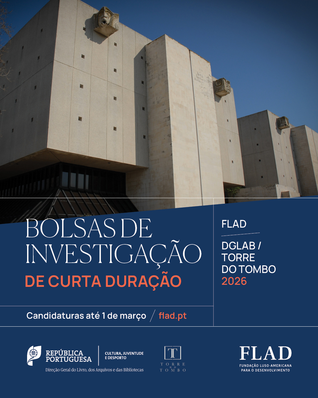 A Direção-Geral do Livro, Arquivos e Bibliotecas /Arquivo Nacional Torre do Tombo e a Fundação Luso-Americana para o Desenvolvimento, no âmbito do protocolo estabelecido, anunciam a abertura do prazo para apresentação de candidaturas a bolsas de investigação de curta duração para 2026, a decorrer de 15 de janeiro a 1 de março.